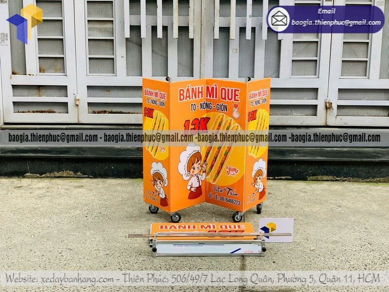 Mẫu tủ bán bánh mì bán dạo lắp ráp lưu động trên vỉa hè - Xưởng sản xuất & Công Ty Thiên Phúc là xưởng chuyên nhận gia công - sản xuất - thiết kế & in ấn logo thương hiệu - nhãn hiệu - menu sản phẩm theo yêu cầu khách hàng với hơn 10 năm kinh nghiệm, cung cấp nhiều mẫu tủ/quầy/xe bán hàng gấp gọn lưu động, chỉ cần 700.000đ/xe trở lên với chất lượng ốp bạt,... chưa kèm theo chi phí khác như menu, đèn led, ô dù, kệ xếp,... Hỗ trợ xuất hóa đơn VAT. Đặt hàng từ 10 kệ trở trở lên giảm mỗi kệ 50.000đ. Giao hàng nhanh trên toàn quốc. Thiết kế logo hoàn toàn miễn phí.